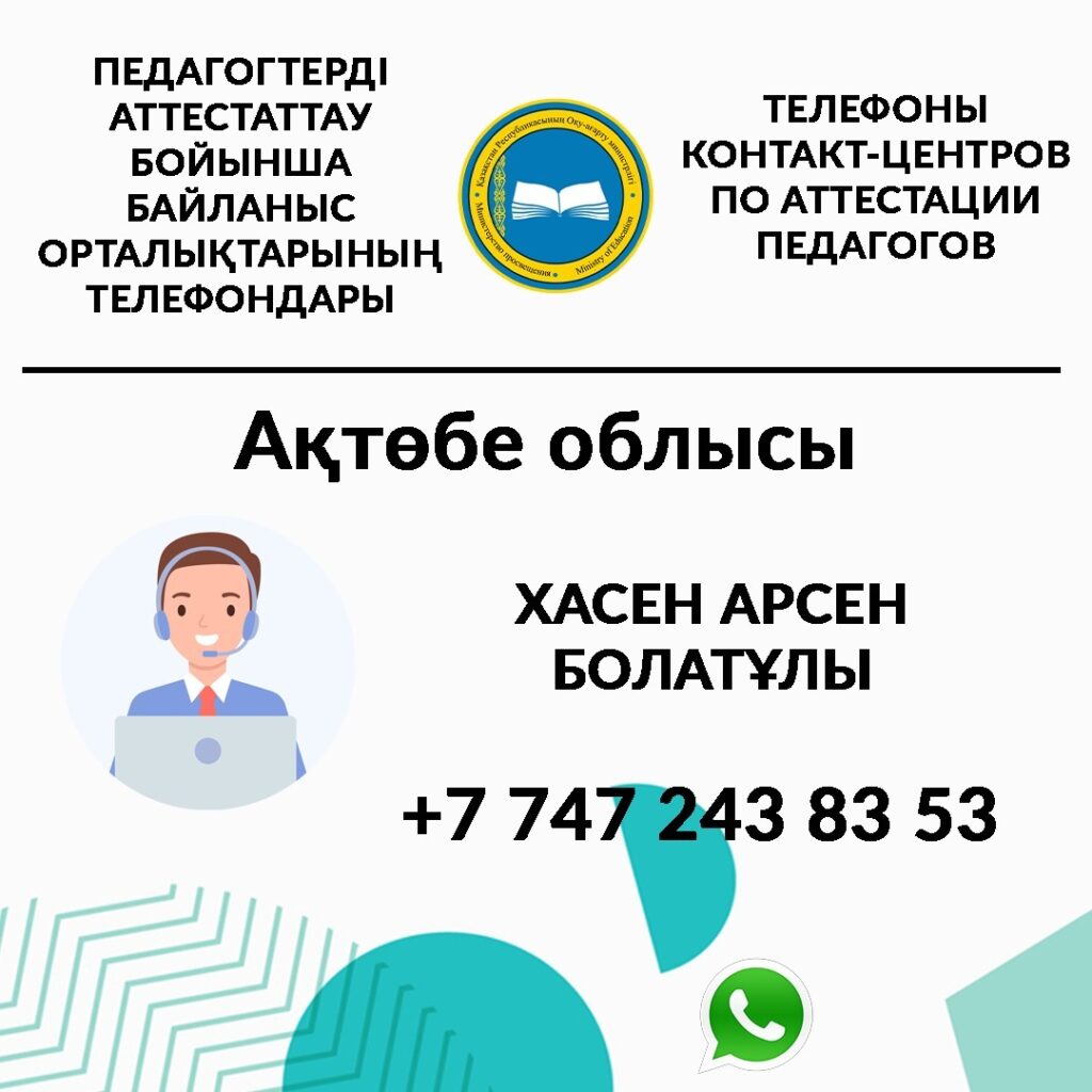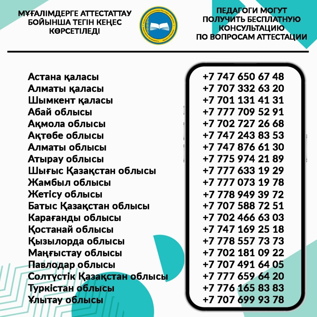 ҚР Оқу-ағарту министрлігінің Орта білім комитеті еліміздің барлық өңірлерінде байланыс орталықтарын ұйымдастырды. Енді аттестаттау бойынша сұрақ туындаса көрсетілген нөмірге қоңырау шалып, жауапты маманға жүгінуге болады. Байланыс орталықтары дүйсенбі, жұма аралығында сағат 09:00-ден 18:30-ға дейін жұмыс істейді. Педагогтерді аттестаттау бойынша байланыс орталықтарының телефондары: