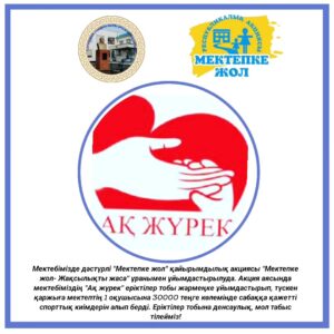 Мектебімізде дәстүрлі «Мектепке жол» қайырымдылық акциясы «Мектепке жол- Жақсылықты жаса» ұранымен ұйымдастырылуда. Акция аясында мектебіміздің «Ақ жүрек» еріктілер тобы жәрмеңке ұйымдастырып, түскен қаржыға мектептің 1 оқушысына 30000 теңге көлемінде сабаққа қажетті спорттық киімдерін алып берді. Еріктілер тобына денсаулық, мол табыс тілейміз!